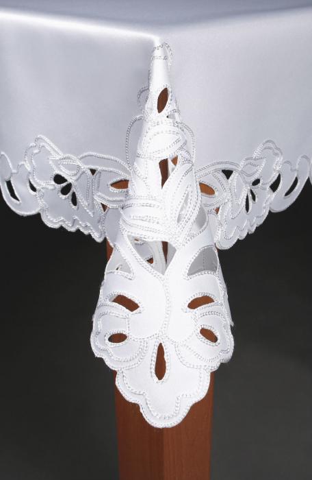 Obrusy i serwety PAULA ozdobione są kwiatowymi haftami typu Richelieu, dostępne w kształcie prostokątnym w kolorach białym